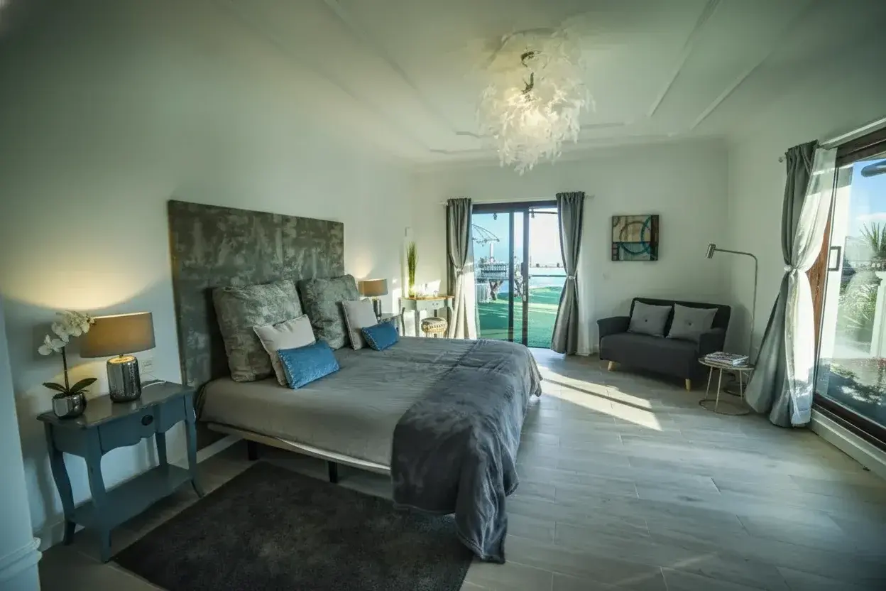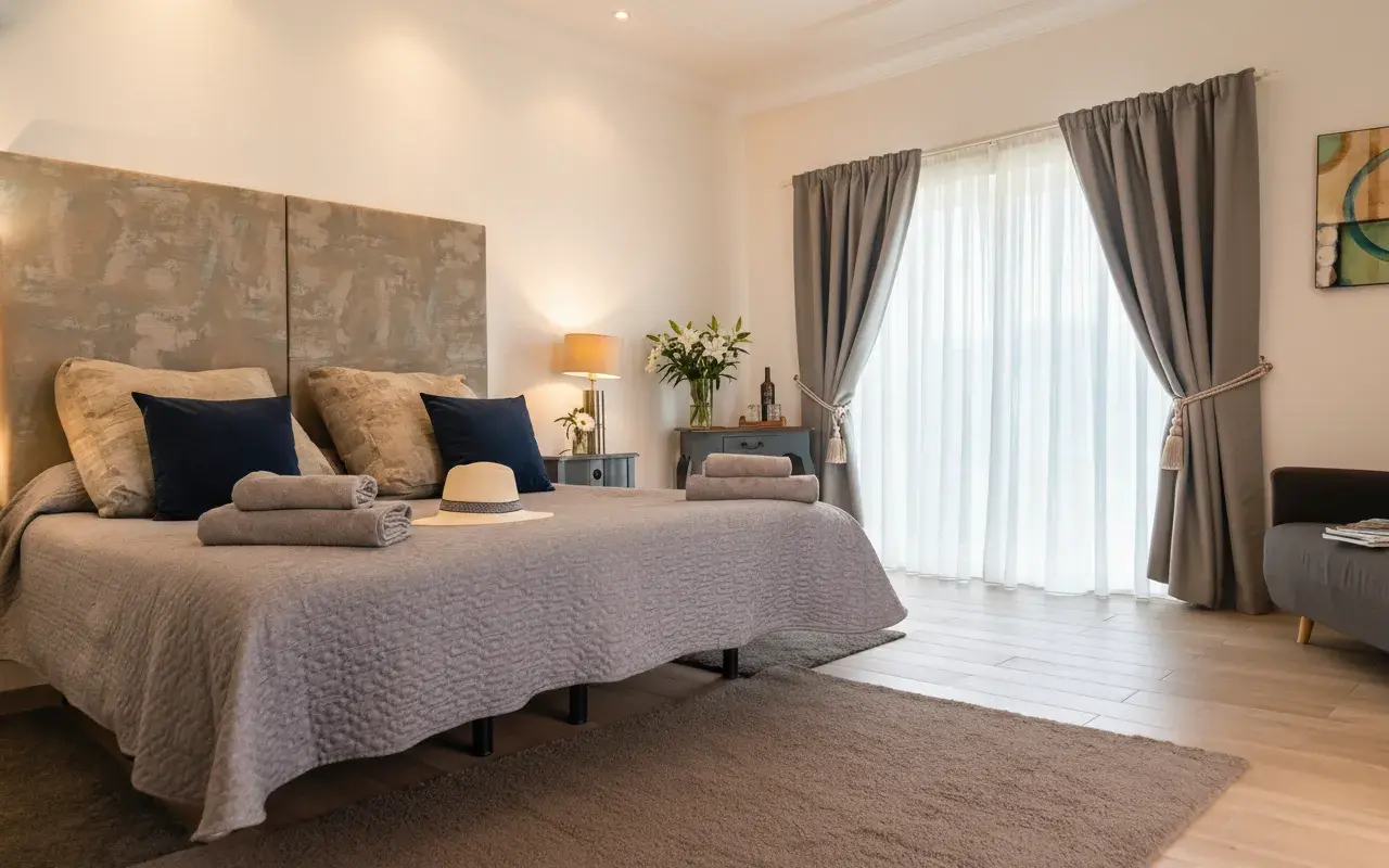 Esta habitación de descanso ofrece una comodidad inigualable con su cama de gran tamaño y una decoración suave y relajante. La luz natural fluye por todas las esquinas, creando un ambiente perfecto para relajarse. Las vistas a la Montaña de Tamia y a la piscina, acompañadas del aire fresco de la zona, te permitirán desconectar por completo.